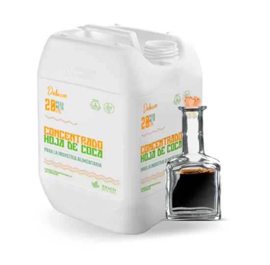 Extracto líquido de Hoja de Coca para uso en la industria alimentaria, producto que conserva las bondades de esta hoja milenaria como antioxidantes, compuestos aromáticos, vitaminas y minerales. Nivel de alcaloides no detectable